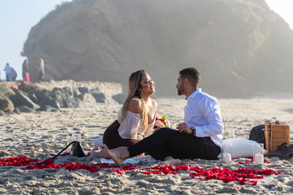 Patrick wanted to propose at Sara's favorite beach. So there was no better place to do this magical surprise proposal. He hired Unveiled By Grace to set up a little picnic for them. Grace did a great job decorating, and even set up flower petals to spell MARRY ME.